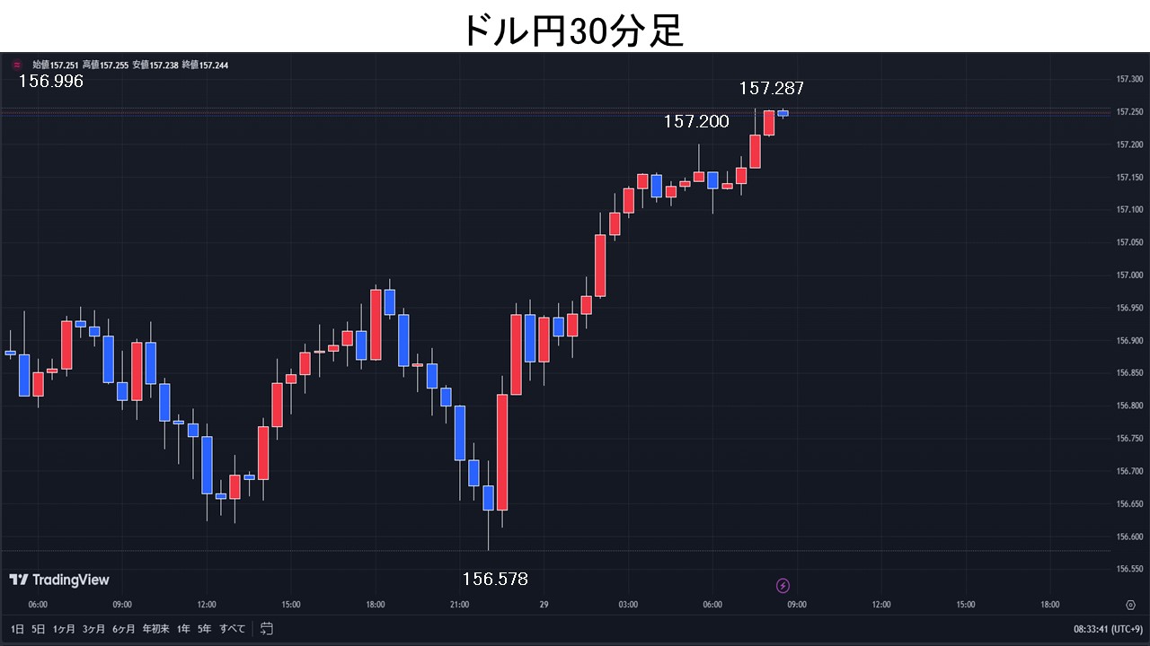ドル円、5月米消費者信頼感指数予想上振れを受け157.20円まで上昇。