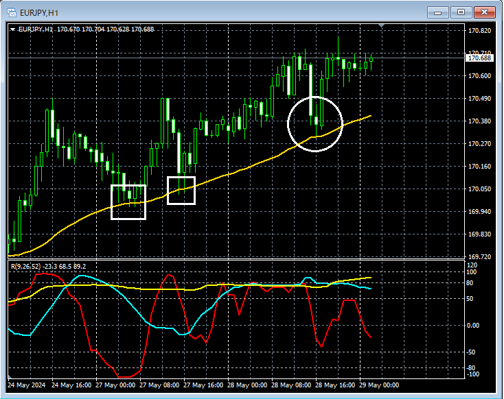 上の1時間足で白い円で囲ったあたりを見ると過去に数回サポートとして機能してきた移動平均線付近まで下げており、この移動平均線を明確に下抜けするまでは下位足で買いを考えてもおかしくない場面かもしれない。