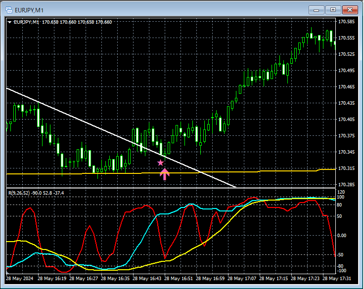 上の1分足では過去に数回サポートとして機能してきた移動平均線付近で反発してカウンタートレンドラインを上抜けした後の下げでmBDSR(フィルター:RCI26とRCI52)の押し目買いサインが点灯して上昇している。