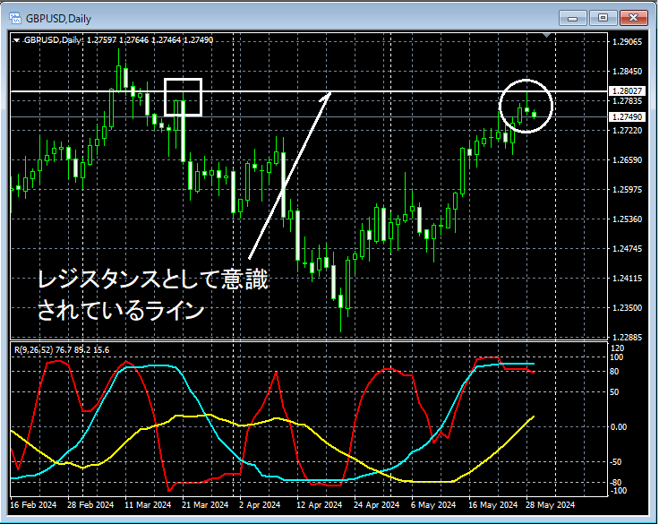上の日足で白い円で囲ったあたりを見ると過去に数回レジスタンスとして機能してきた水平線付近まで上昇しており、この水平線を明確に上抜けするまでは下位足で戻り売りを考えてもおかしくない場面かもしれない。