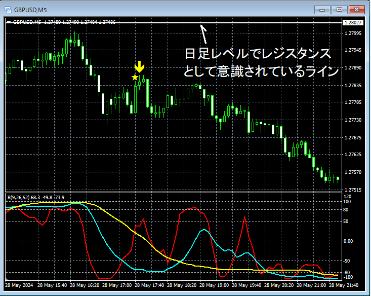 上の5分足では過去に数回レジスタンスとして機能してきた水平線付近で反落気味。その後の上昇でmBDSR(フィルター:RCI26とRCI52)の戻り売りサインが点灯して下落している。