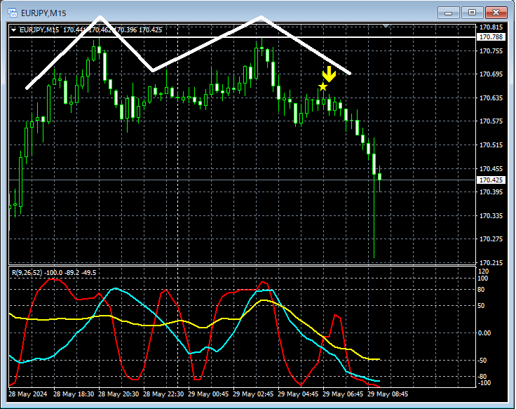 上の15分足では1時間足でツーバーリバーサルの出現とともに下落してきた後の上昇でmBDSR(フィルター:RCI26とRCI52)の戻り売りサインが点灯してさらに下落してダブルトップを形成している。