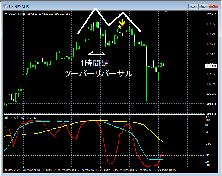上の15分足では1時間足でツーバーリバーサルの出現とともに下落してきた後の上昇でmBDSR(フィルター:RCI26とRCI52)の戻り売りサインが点灯してさらに下落してダブルトップを形成している。