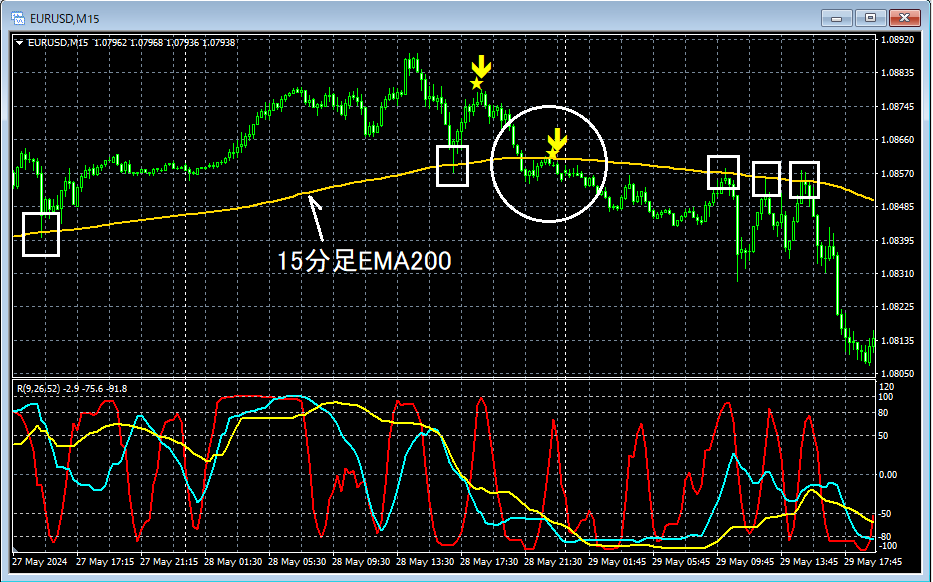 上の15分足で白い円で囲ったあたりを見ると過去に数回サポートとして機能してきた移動平均線付近を明確に割り込んでおり、サポレジ転換の考え方から、この移動平均線は今後はレジスタンスとして機能する可能性があると考えてもおかしくない場面かもしれない。