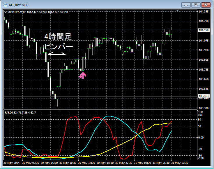 上の30分足では4時間足でピンバーの出現とともに上昇してきた後の下げでmBDSR(フィルター:RCI26とRCI52)の押し目買いサインが点灯してさらに上昇している。