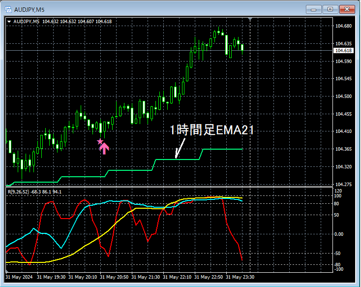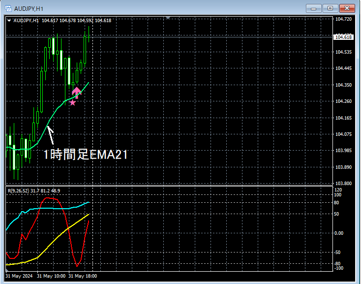 上の5分足を見ると1時間足EMA21付近で反発した後、5分足でもmBDSR(フィルター:RCI26とRCI52)の押し目買いサインが点灯してさらに上昇している。
