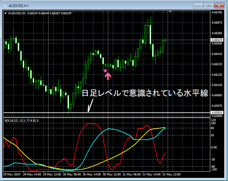上の1時間足を見ると日足レベルで意識されている水平線付近で反発した後、mBDSR(フィルター:RCI26とRCI52)の押し目買いサインが点灯している。ここでは下位足でもう少し詳しく見てみることにする。