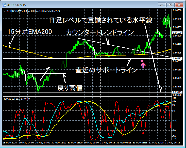 上の15分足を見ると日足レベルで意識されている水平線付近で反発して戻り高値を上抜けした後、EMA200を明確に上抜けしている。その後下げるもEMA200を明確に割り込むことがない展開。その後、カウンタートレンドライン上抜け後の下げでmBDSR(フィルター:RCI26とRCI52)の押し目買いサインが点灯してさらに上昇している。このサインは、第3波の初動をとらえているという言い方もできるかもしれない。