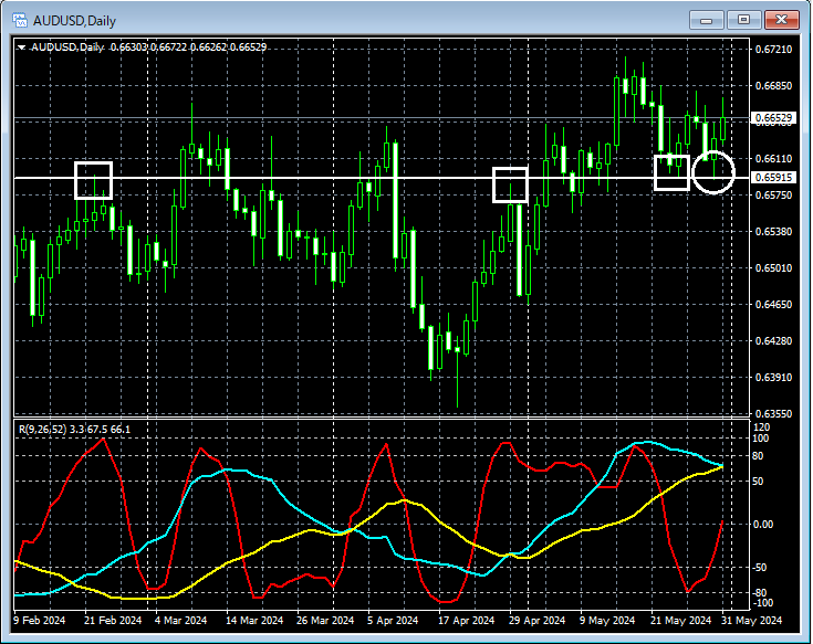 上の日足で白い円で囲ったあたりを見ると、過去にレジスタンスやサポートとして意識されている水平線付近まで下げており、ここを明確に割り込むまでは反発を狙ってもおかしくない場面と言えるかもしれない。