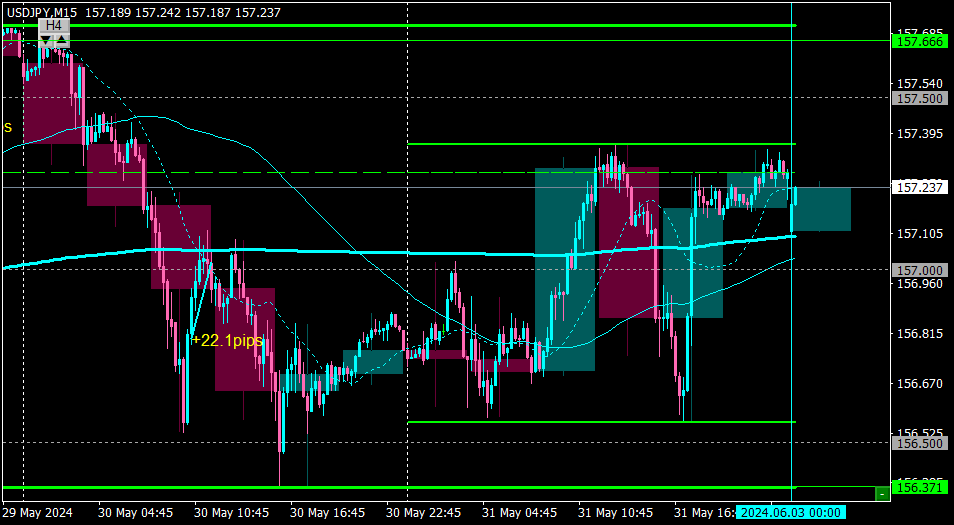 先週の金曜は、予想通り156.50付近で下げ止まったが、V字となってエントリーのタイミングが取れなかったのと、週末で持ち越したくなかったのでエントリーせず。