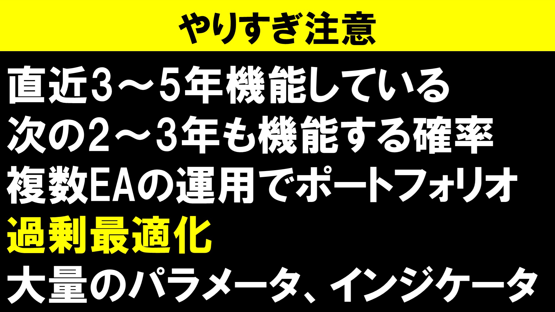 話すと長くなるので詳細は別の機会に譲りますが、簡単に言うと大量のパラメータや条件で取り引きしているようなロジックは未来に於いて同じ条件が揃う可能性が低いので、結果再現性も低くなると言う問題です。