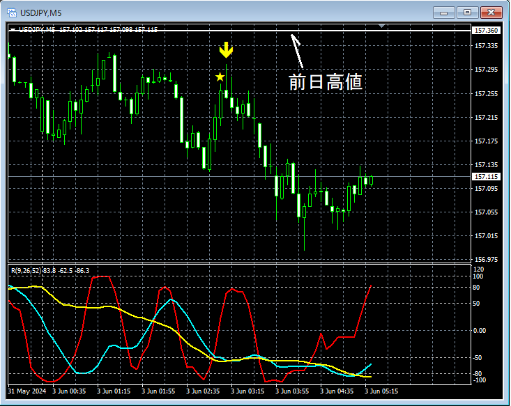 上の5分足では前日高値付近まで上昇後、mBDSR(フィルター:RCI26とRCI52)の戻り売りサインが点灯して下落している。