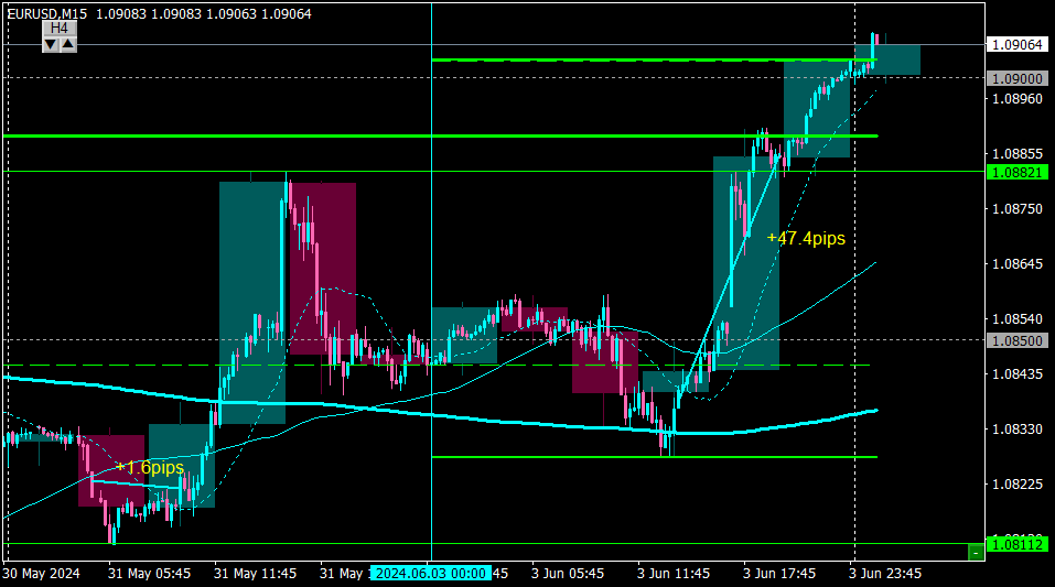 H4MAでサポートされたのを確認してからロング。+47.4pips