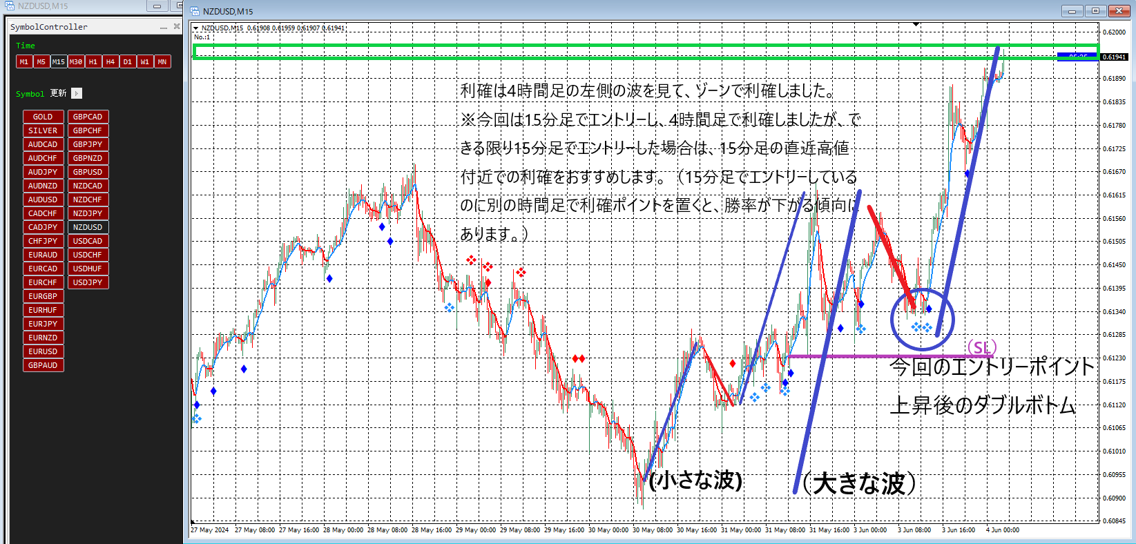 ※今回は15分足でエントリーし、4時間足のポイントで利確していますが、