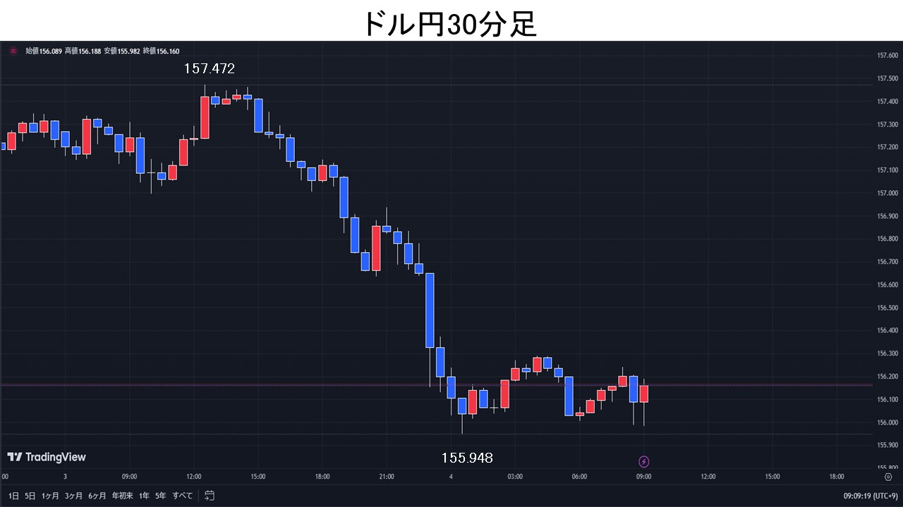 東京時間、ドル円は、仲値で本邦輸出企業によるドル売り観測から157.00円まで下押しとなるが、その後は本邦輸入企業による月初のドル買い観測で157.47円まで上昇。欧州時間、ドル円は157円台前半で小動き。NY時間、5月米ISM製造業景況指数が48.7と予想49.6を下回ると、米10年債利回りが低下しドル売りが先行。ドル円は、一時156円を割り込み155.94円まで下落。