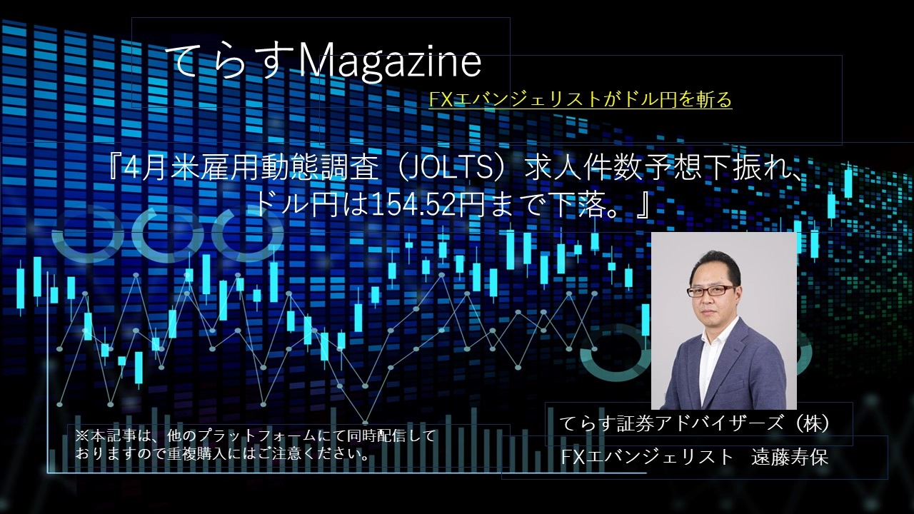 東京時間、ドル円は、仲値で本邦輸出企業によるドル売り観測から157.00円まで下押しとなるが、その後は本邦輸入企業による月初のドル買い観測で157.47円まで上昇。欧州時間、ドル円は157円台前半で小動き。NY時間、5月米ISM製造業景況指数が48.7と予想49.6を下回ると、米10年債利回りが低下しドル売りが先行。ドル円は、一時156円を割り込み155.94円まで下落。