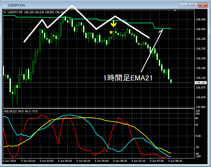 チャートの推移を見守ると1時間足EMA21がレジスタンスとなり三尊を形成して下げ転換から大きく下げていることが分かる。三尊の右肩形成中にmBDSR(フィルター:RCI26とRCI52)の戻り売りサインが点灯している。