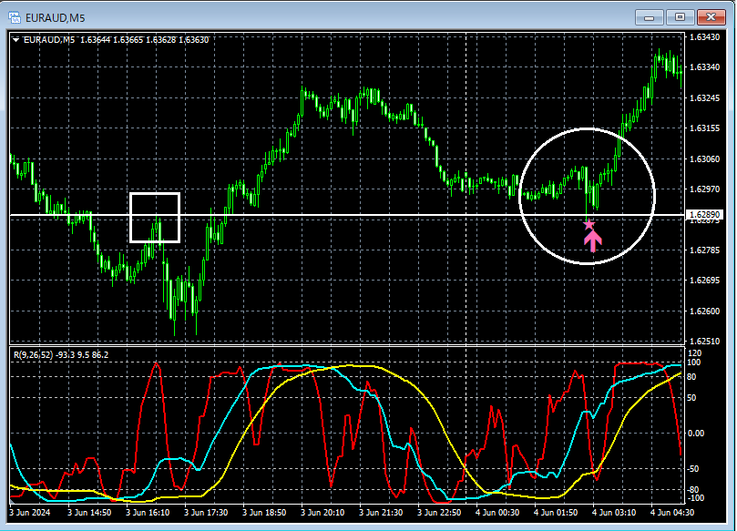 上の5分足で白い円で囲ったあたりを見ると過去にレジスタンスとして機能した水平線付近まで下げた後、mBDSR(フィルター:RCI26とRCI52)の押し目買いサインが点灯して大きく上昇している。