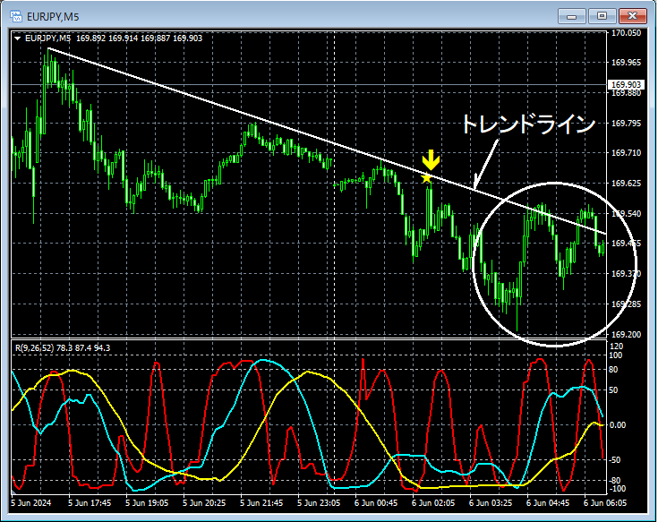 上の5分足では、下降トレンドライン付近まで上昇してきたところでmBDSR(RCI2本フィルター)の戻り売りサインが点灯し、その直後からプライスはしっかりと下げていることが分かる。その後、下降トレンドラインを上抜けする局面があったことから、白い円で囲ったあたりを詳しく見てみることにする。