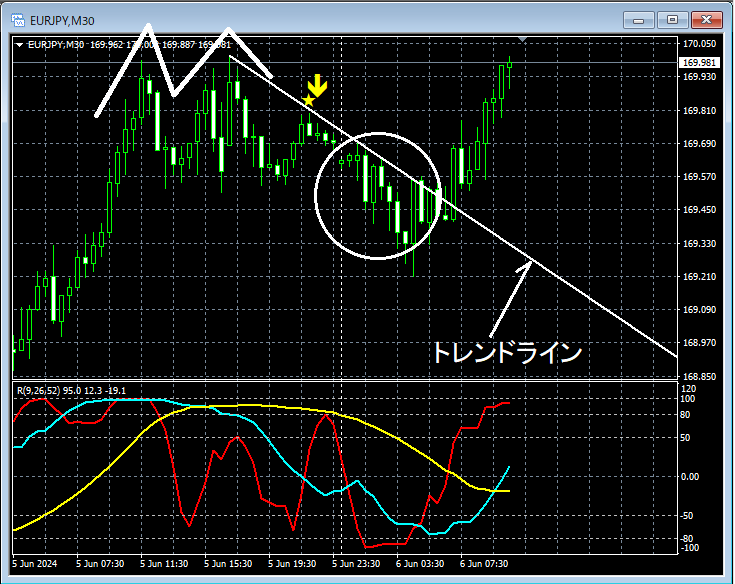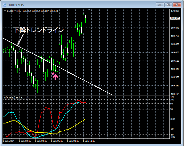 下降トレンドライン上抜けは下降から上昇へのトレンド転換を示唆するチャートパターンと見る場合がある。