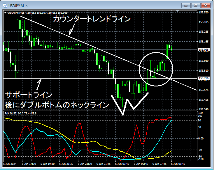 上の15分足を見てみると、ダブルボトムを形成して上昇した後、カウンタートレンドラインをいったん上抜けしている。白い円で囲ったあたりを下位足でさらに詳しく見てみることにする。
