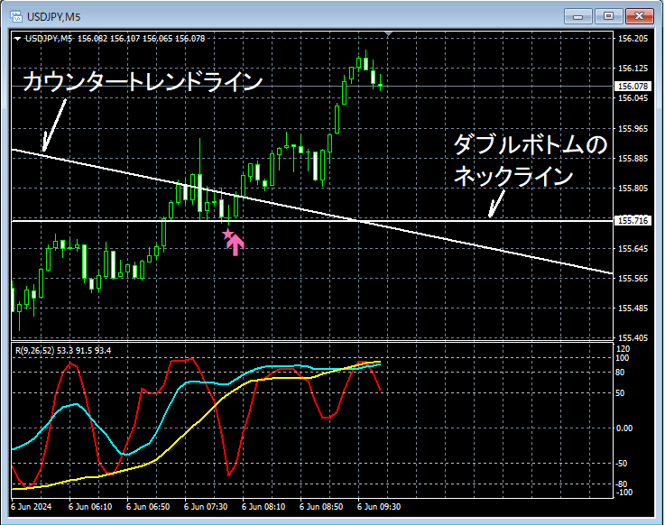 上の5分足では、カウンタートレンドラインをいったん上抜けした後にダブルボトムのネックライン付近まで下げたところでmBDSRの(RCI2本フィルター)の押し目買いサインが点灯して、その後、プライスはしっかりと上昇していることが分かる。
