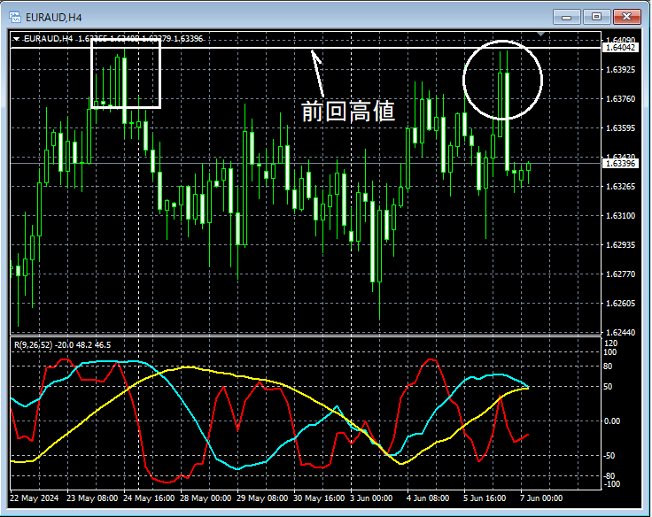 上の1時間足で白い円で囲ったあたりを見ると前回高値付近まで上昇しており、この水平線を明確に上抜けするまでは下位足で戻り売りを考えてもおかしくない場面かもしれない。