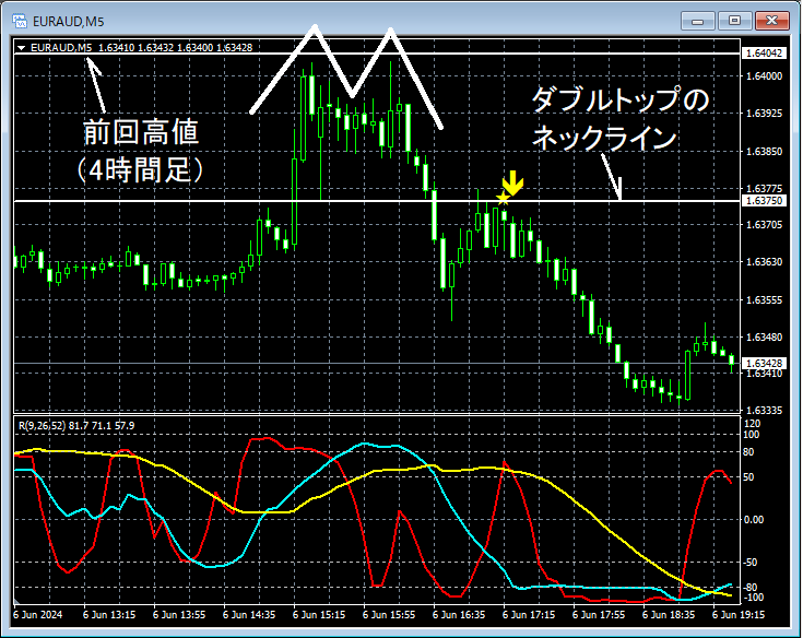 上の5分足では、4時間足レベルの前回高値付近まで上昇後、ダブルトップを形成して反落している。そして、そのダブルトップのネックライン付近まで上昇したところでmBDSR(フィルター:RCI26とRCI52)の戻り売りサインが点灯してさらに下げている。