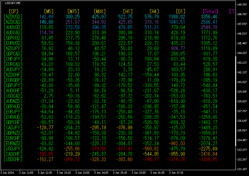 [Total]数値の降順に並んでいます。一番上の行にあるNZDUSDは、全ての時間足で青色系の表示色になっています。しかもTotal数値が 3356.46と大きなプラスの数字になっています。NZDUSDに大きな上昇トレンドが発生していることを示しています。