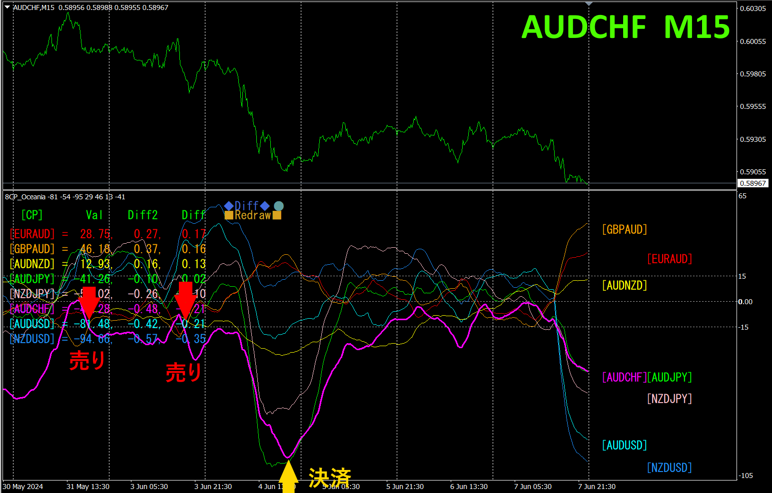 AUDCHFが他のグラフ群から下抜けしてきたところが、絶好の売りポイントです。「見える化インジケータ」のAUDCHFが反転したら決済します。約90pipsの利益が得られました。