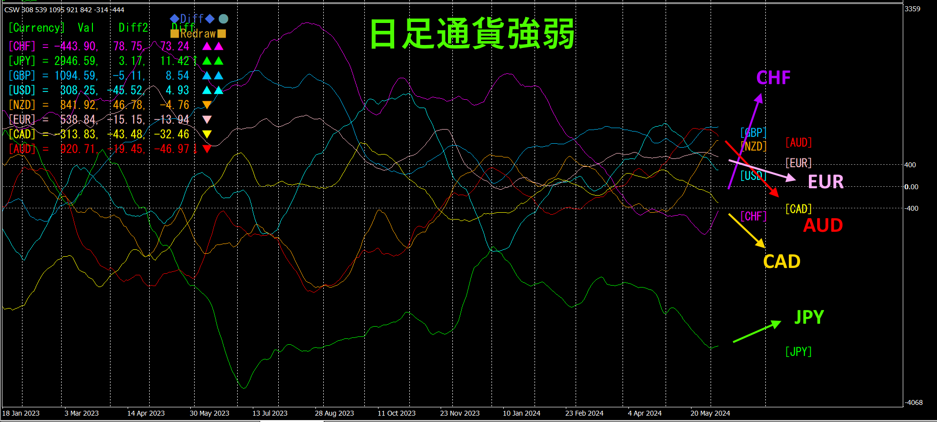CHF、JPYが上向きです。一方、AUD、CAD、EURが下向きになっています。日足通貨強弱チャートではCHFの上昇が目立っています。相変わらずJPYは最も弱い通貨で、低迷中です。