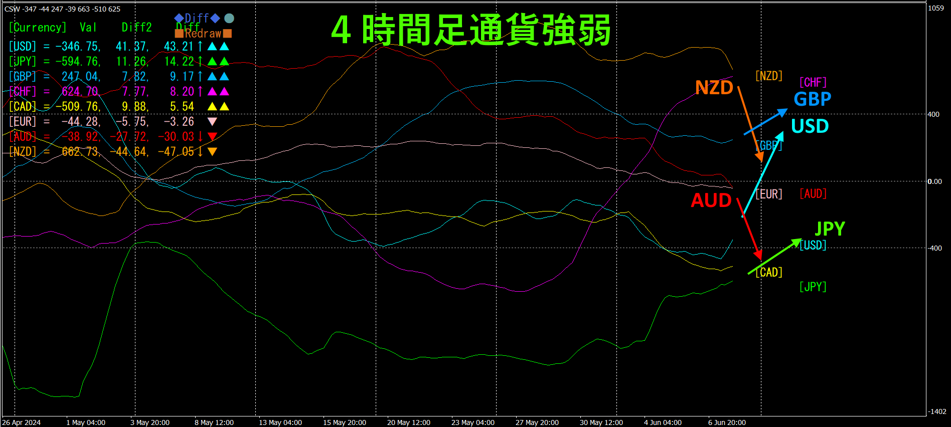 4時間足では、USD、JPY、GBPが上昇しています。一方、NZD、AUDが下向きになっています。