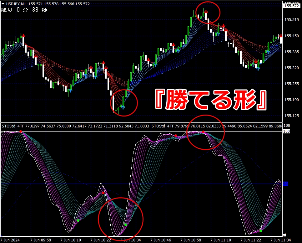 ★ サイン点灯後、ピンク帯が緑帯をすくい上げる形状で必勝エントリー!