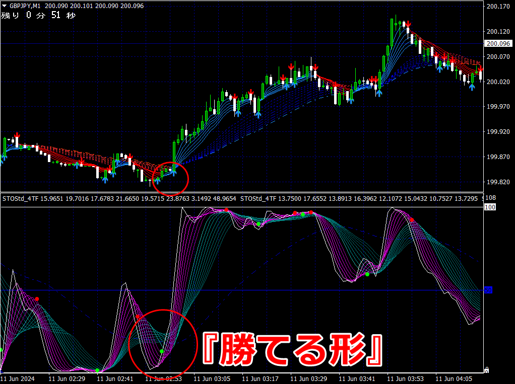 ② 矢印サイン点灯状態で、インジケーターのピンク色の帯が、緑の帯を下からすくい上げるような形状であれば、現在のローソク足が確定する数秒前か確定の直後に1分判定または3分判定でハイエントリーします。