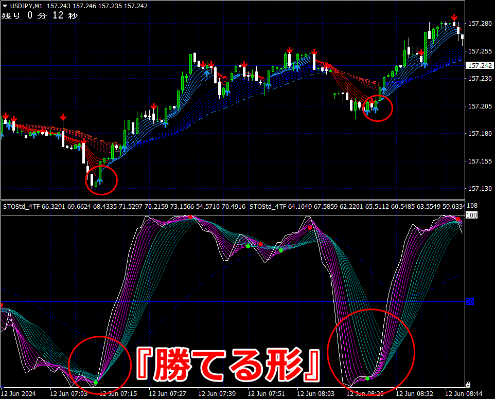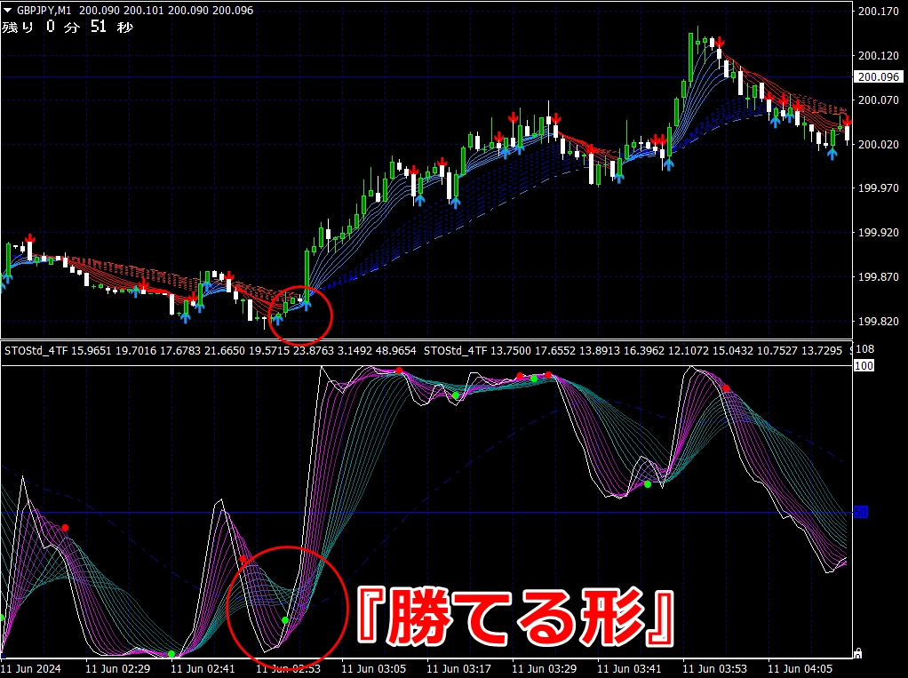 ★ サイン点灯後、ピンク帯が緑帯をすくい上げる形状で必勝エントリー!