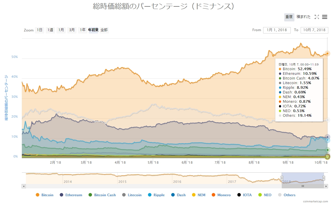 画像は2018年10月07日のキャプチャ。全体的に凪ぎが引き継がれ、「赤」も「緑」も入り交じった相場環境です。ただ、リップルは「真紅」で6%の下落となっています。