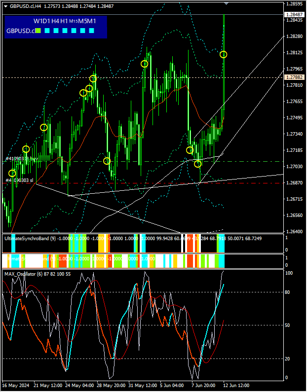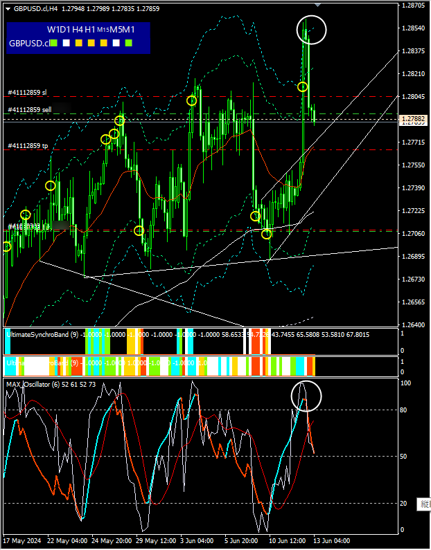 主力インジケータの、MAXオシレーターは、波の切り返しを示唆。アルティメットシンクロバンド共に、波の継続、強弱が可視化されます。