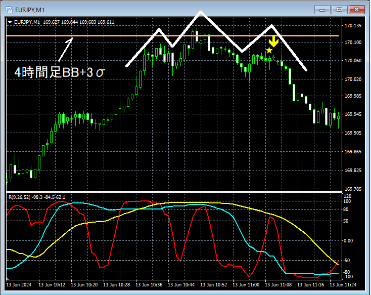 上の1分足では、4時間足ボリンジャーバンド(+3σ)付近まで上昇したところで三尊を形成してプライスは順調に下げている。結果として、その三尊の右肩でmBDSR(フィルター:RCI26とRCI52)の戻り売りサインが点灯している。