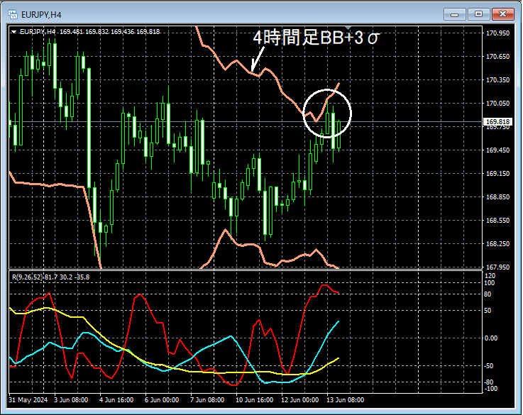 昨日のユーロ円チャートから ボリンジャーバンドにおける逆張りと三尊とmBDSR(RCI2本フィルター)の戻り売りサイン