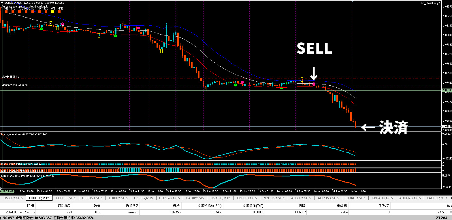 2024年6月14日(金)、通貨ペアは「EUR/USD」、15分足でのトレード履歴です。