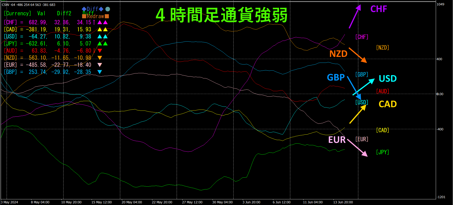 4時間足では、CHF、CAD、USDが上昇しています。一方、GBP、EUR、NZDが下向きになっています。