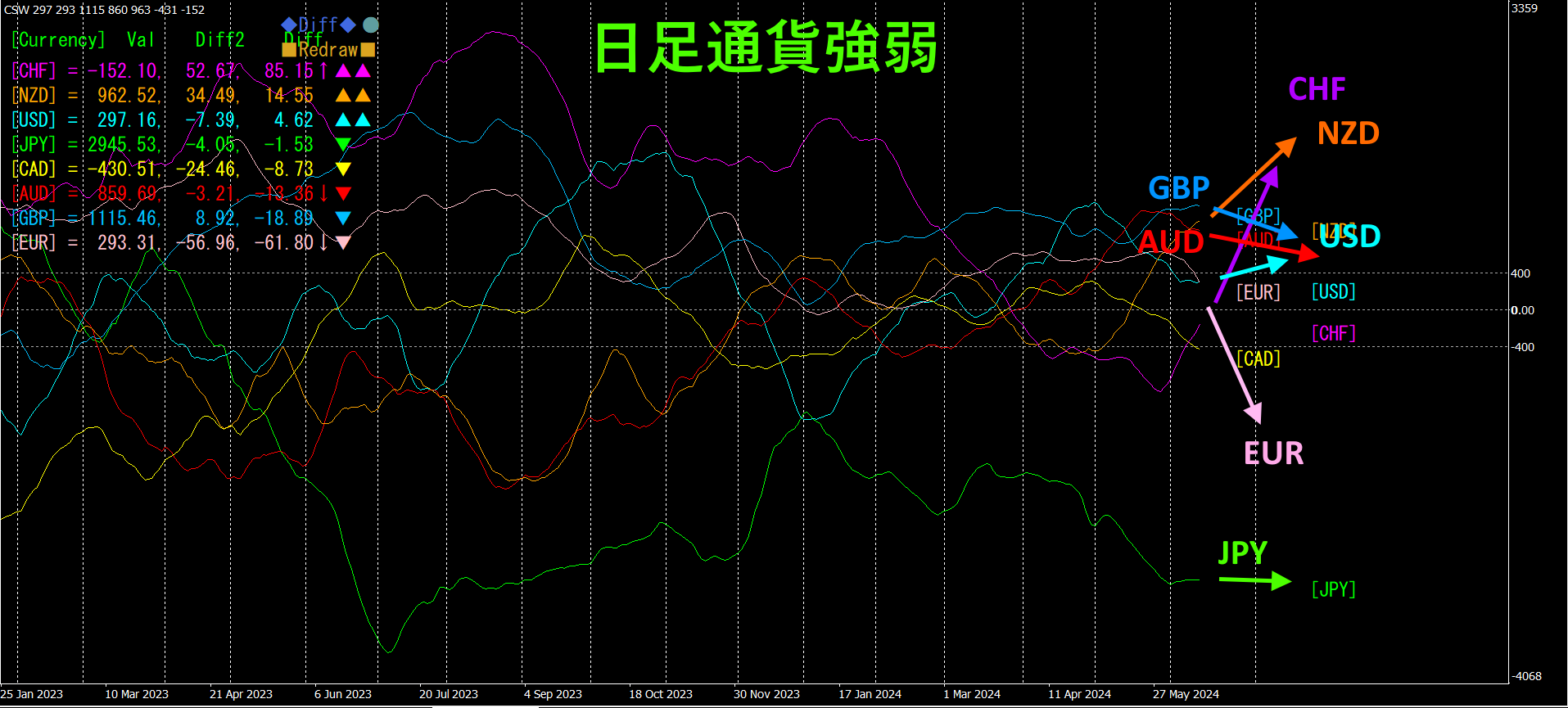 CHF、NZD、USDが上向きです。一方、EUR、GBP、AUDが下向きになっています。日足通貨強弱チャートではCHFの上昇が目立っています。相変わらずJPYは最も弱い通貨で、やや下降気味です。