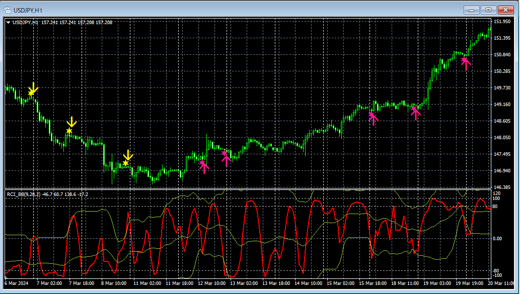 RCIのボリンジャーバンド上限上抜け及び下限下抜けで矢印サインを表示するインジケーター【RCIBBUL】
