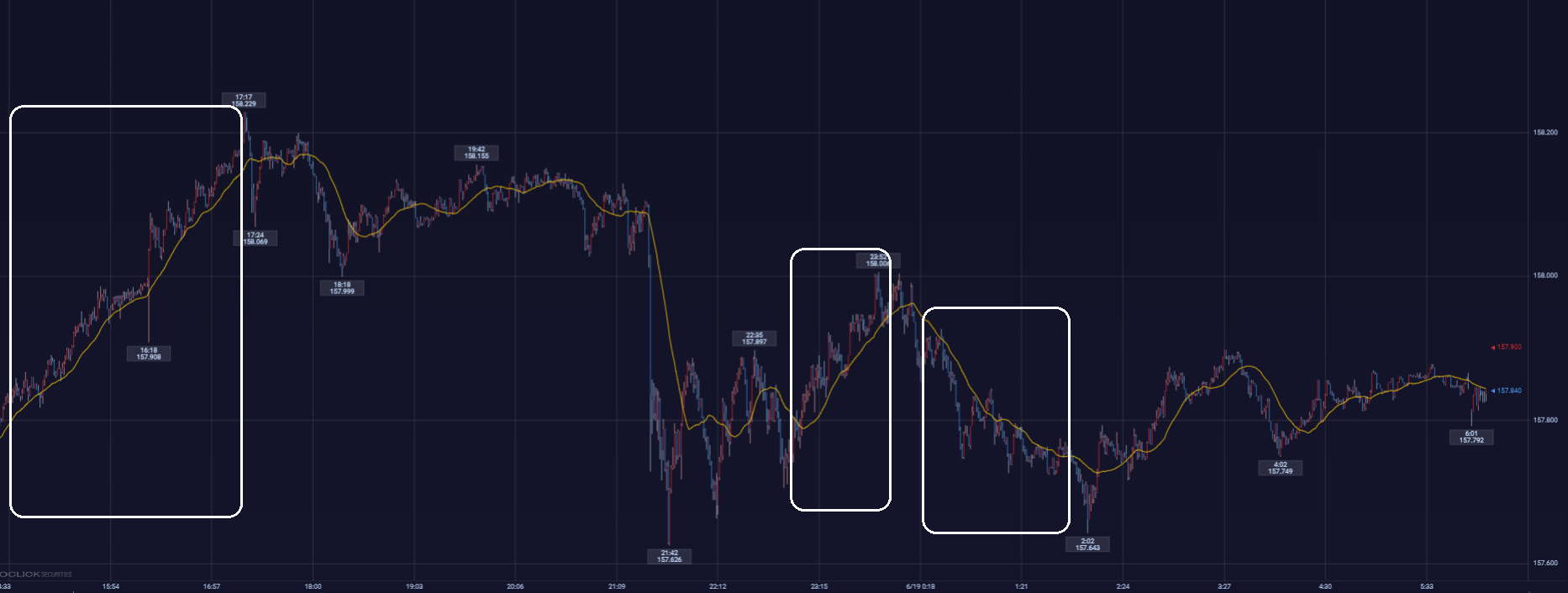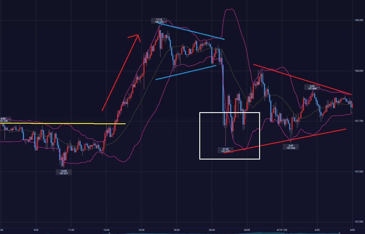 下記チャートは、昨日1日分の動きを5分足で見たドル円チャートです