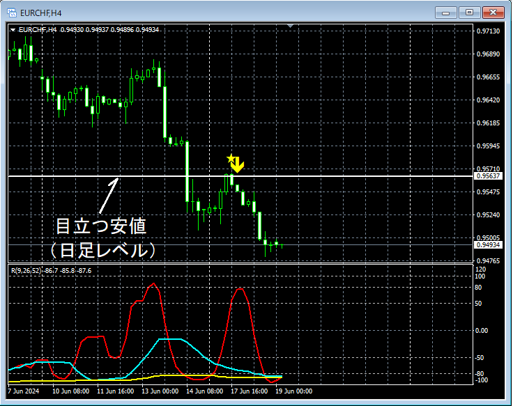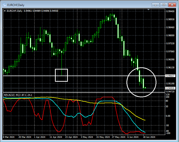 【天底・反転をとらえる!!】最近のユーロスイスのチャートから 上位足の目立つ安値とmBDSR(RCI2本フィルター)の戻り売りサイン 2024年6月19日(水)