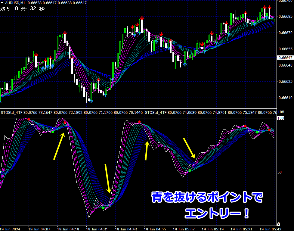 インジケーターの帯はピンク・緑・青の3層構造で、3層の帯は、収斂と拡散を繰り返しますので、 上昇時は、上から ピンク・緑・青 の並びとなり、下落時は、その逆で、上から青・緑・ピンクの並びになります。