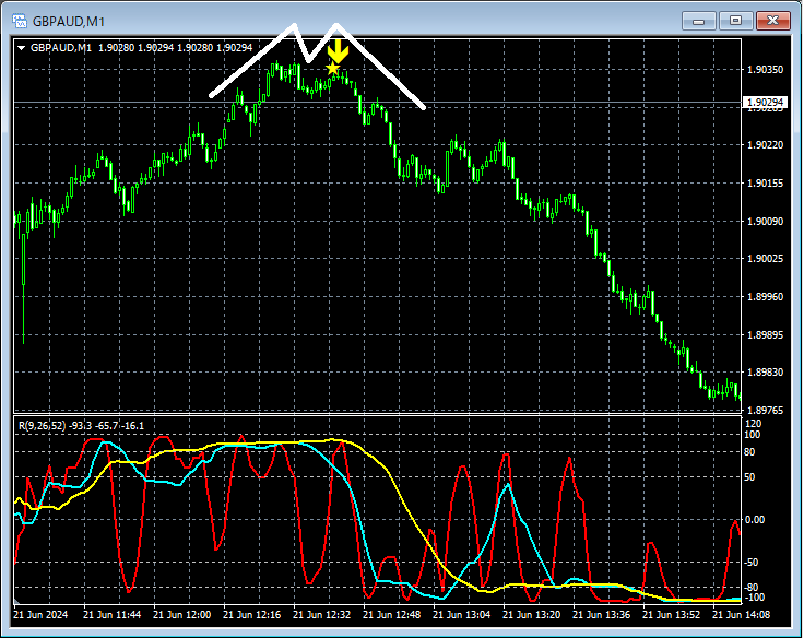 上の1時間足のように、ダブルトップの右側の山でmBDSR(フィルター:RCI26とRCI52)の戻り売りサインが点灯する場合、損切りラインをダブルトップの左側の山の少し上に置くことなどによりリスクリワードの良い優位性の高いトレードが可能になる。