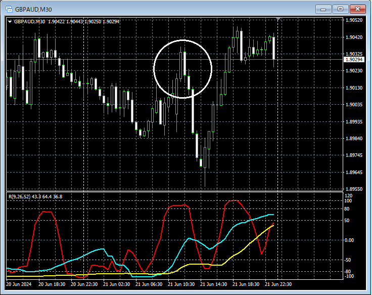 上の30分足で(1時間足ではピンバーが出現している)白い円で囲ったあたりを見てみると、下落を示唆するツーバーリバーサルが出現している。