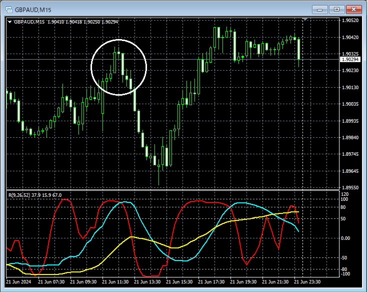 上の1分足では(1時間足でピンバー、30分足でツーバーリバーサル、15分足で酒田五法の宵の明星と呼ばれるローソクのパターンが出現しているあたりでは)ダブルトップが形成されてプライスは大きく下げている。ここで、ダブルトップの右側の山でmBDSR(RCI2本フィルター)の戻り売りサインが点灯していることが分かる。