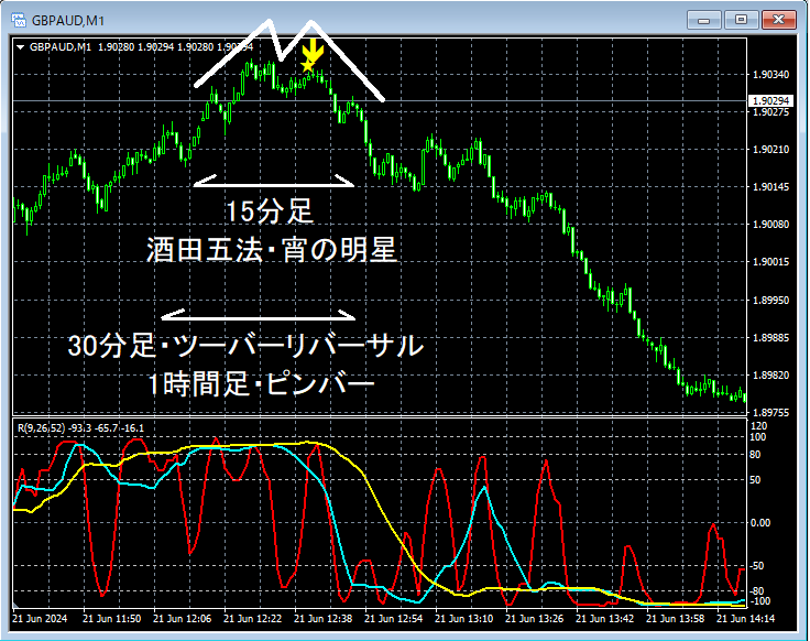 上の15分足で(1時間足ではピンバー、30分足ではツーバーリバーサルが出現している)白い円で囲ったあたりを見てみると、下落を示唆する酒田五法の宵の明星と呼ばれるローソクのパターンが出現している。